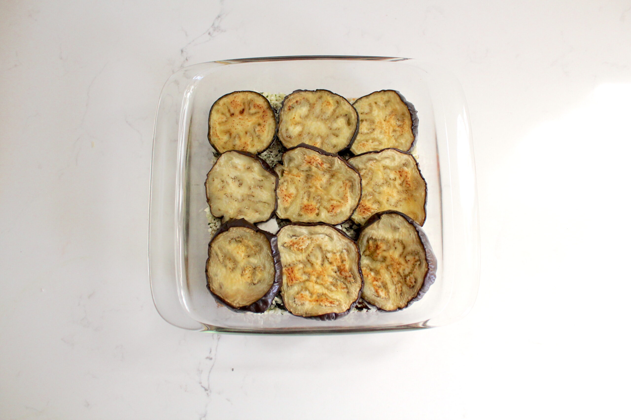 - Spread ½ cup pasta sauce over a 8x8" baking dish; top with a layer of eggplant slices (trim as needed). Drizzle ½ cup sauce over and sprinkle with ½ of the panko mixture plus half of the slices of mozzarella. Repeat these layers of eggplant slices, sauce, panko mixture, and sliced mozzarella.