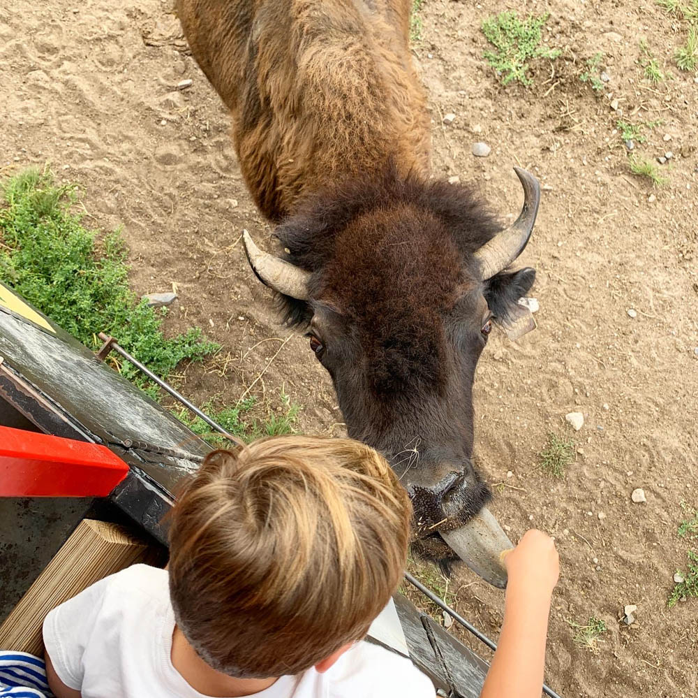 Towards the end, you get to stop right by the bison and FEED them! The kiddos loved seeing their huge, long tongues up close. They also offer horse and pony rides. Afterwards, be sure to stop by Senator’s Steakhouse to try the bison!