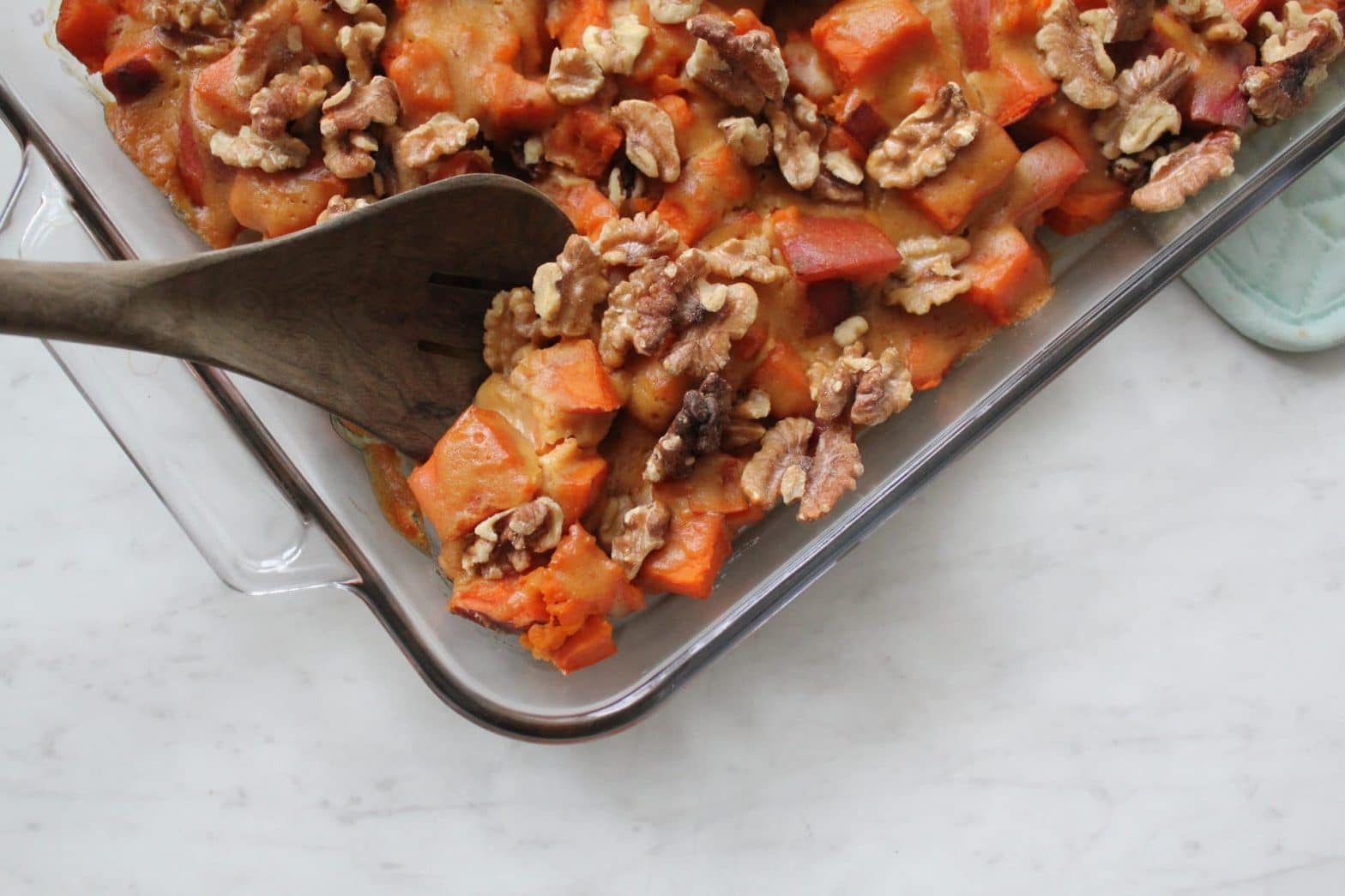 Pour this mixture evenly over the sweet potatoes. Top with pecan or walnut pieces (and mini marshmallows if you're not doing a Whole30!).